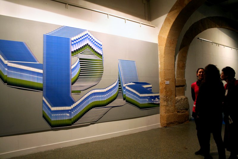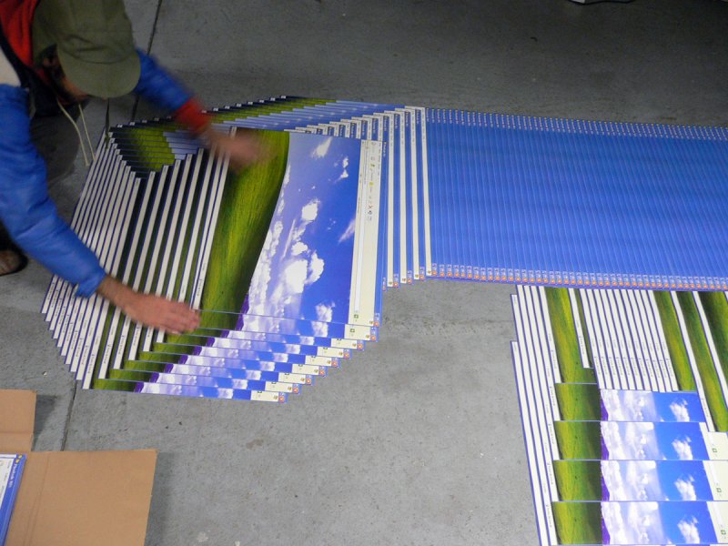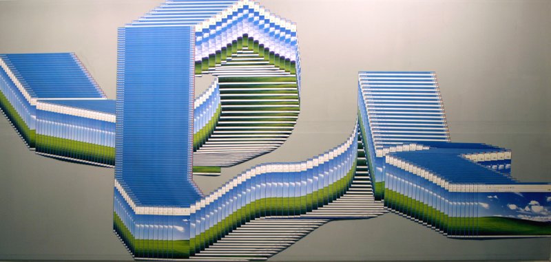 My Favourite Landscape is made of 500 offset prints. It is a reappropriation of the well known desktop picture by Windows XP : Bliss . Accidentaly generated by weaknesses of computer, it sets the common bug out of its context, on a wall, expending it to a much bigger scale. The famous picture finds a new shape of landscape out of its usual frame.