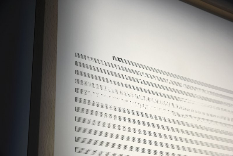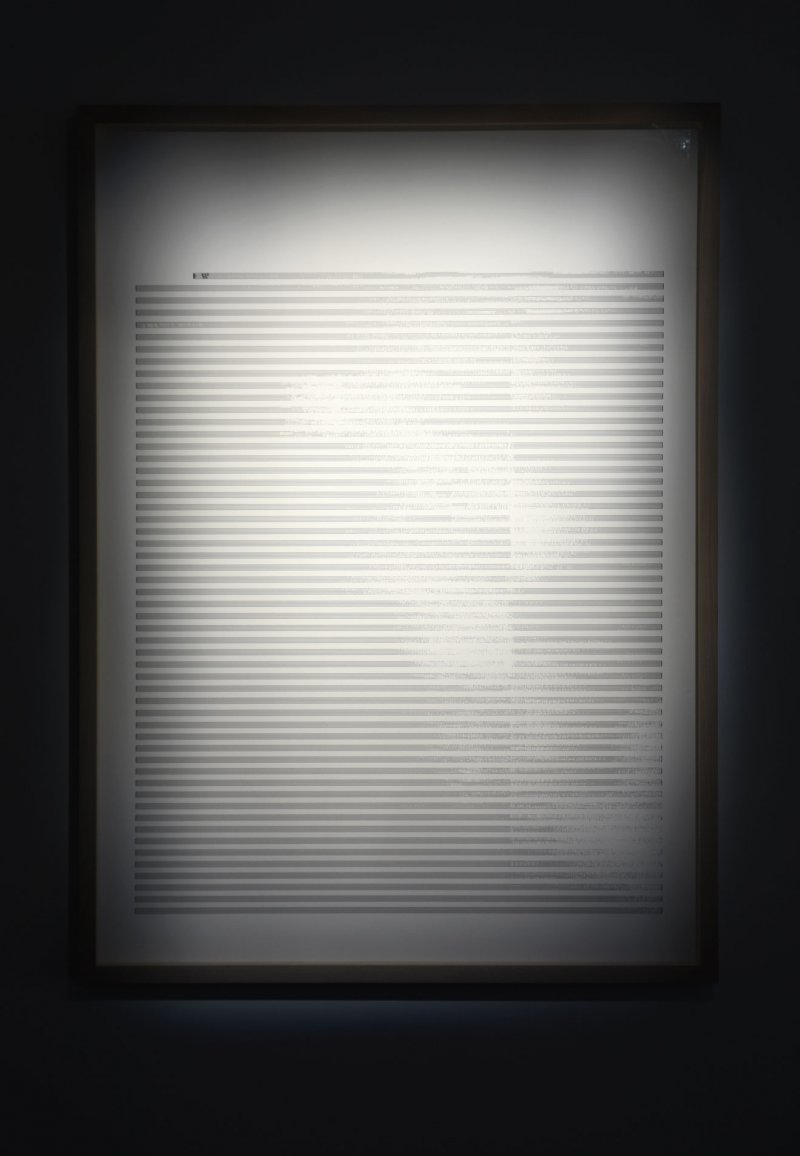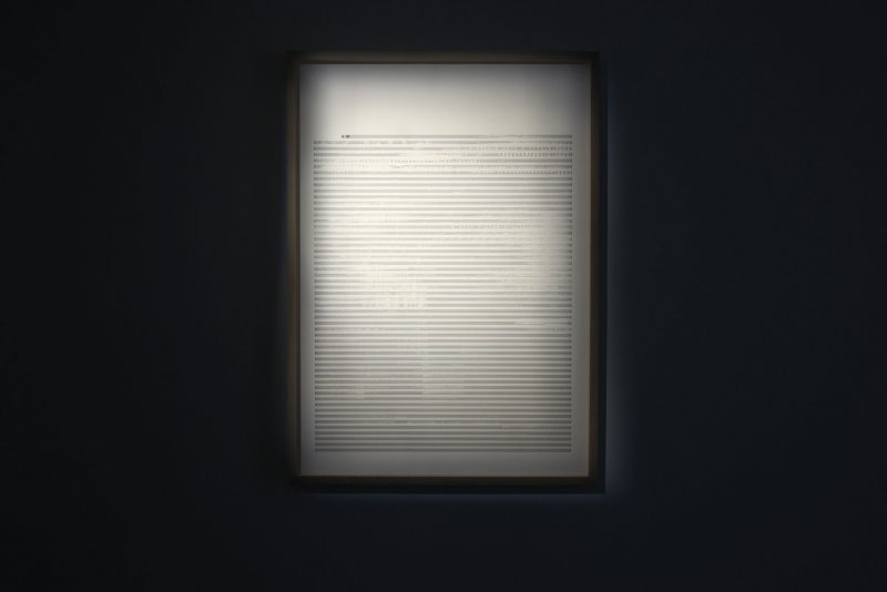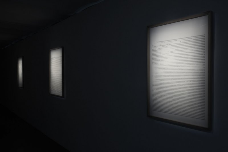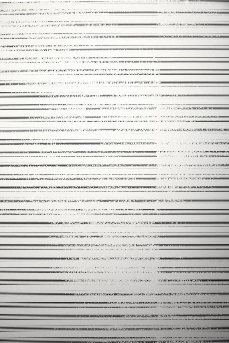 These scores are based on the XML code - a set of X,Y,Z spatial coordinates of the drummer sticks. Once superimposed on the staves, the code, written in negative, disturbs the whole raster as many interruptions and erasures.